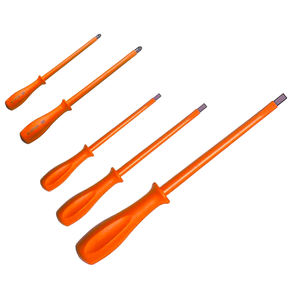 The CATU KIT-03 5-Piece Insulated Screwdriver Kit is designed for live working up to 1,000 V AC and 1,500 V DC. It includes three flat blade and two Pozidriv screwdrivers with orange thermoplastic insulation. Each tool is individually dielectric tested after production, ensuring reliable protection and professional performance for low-voltage electrical installation and maintenance work.
